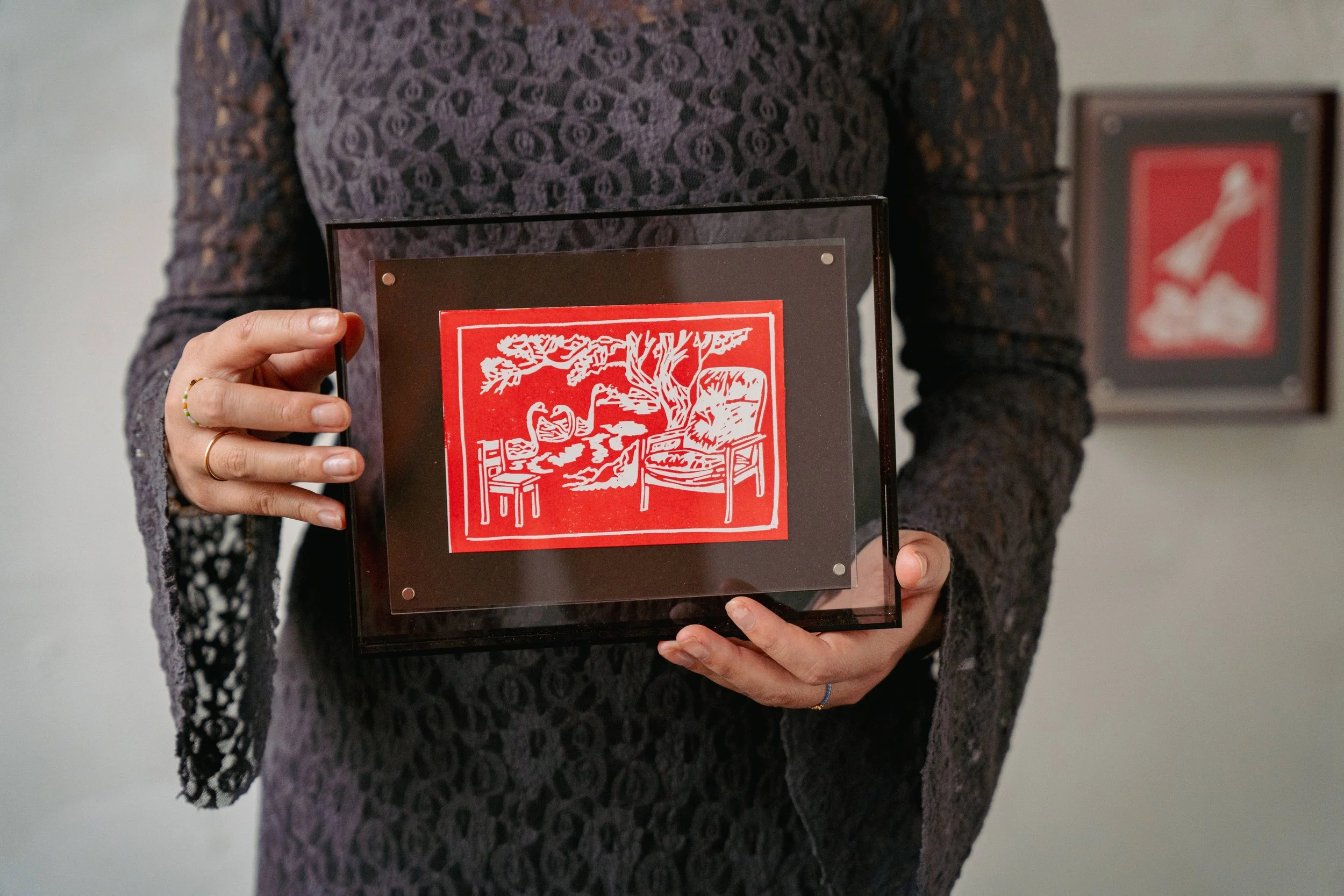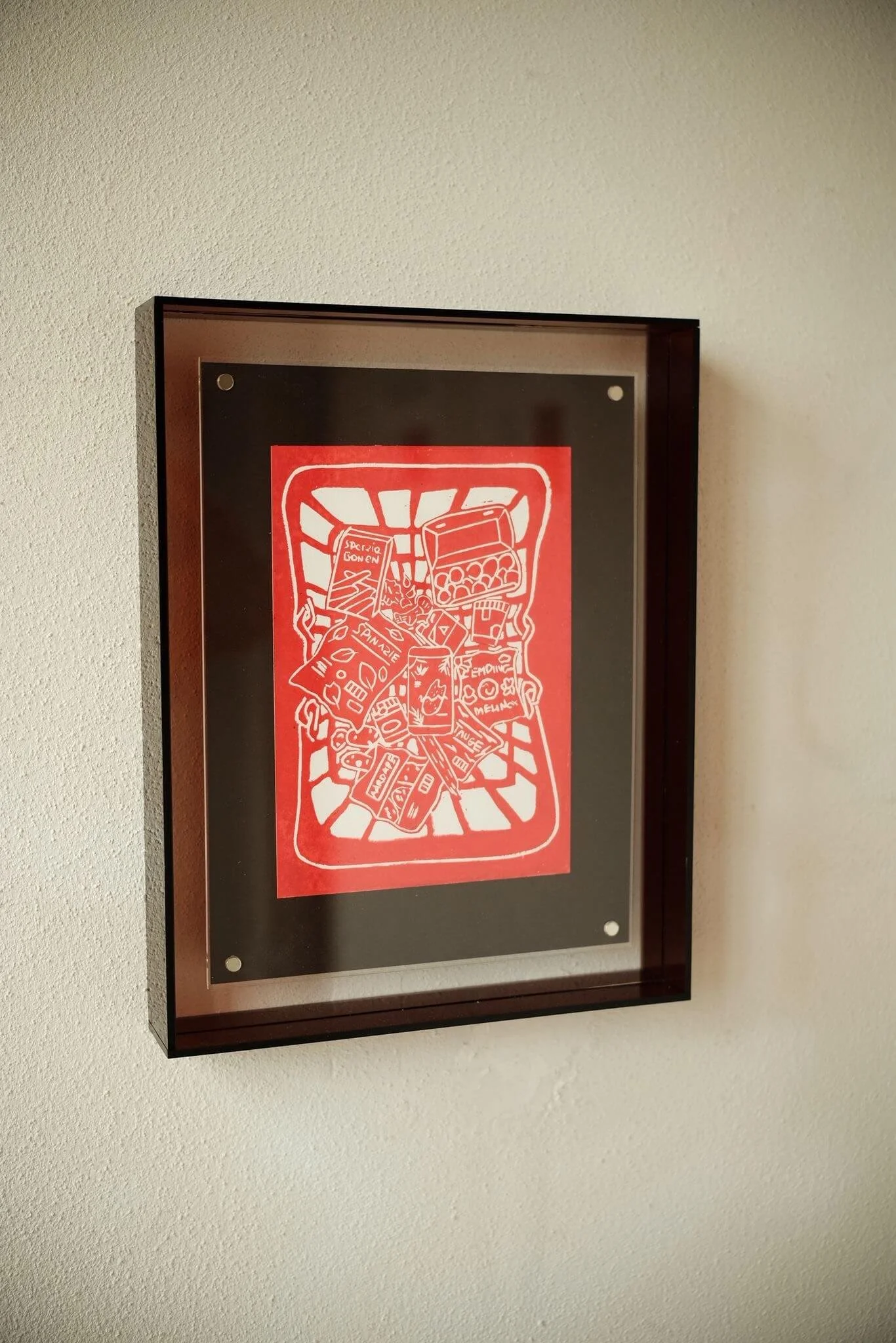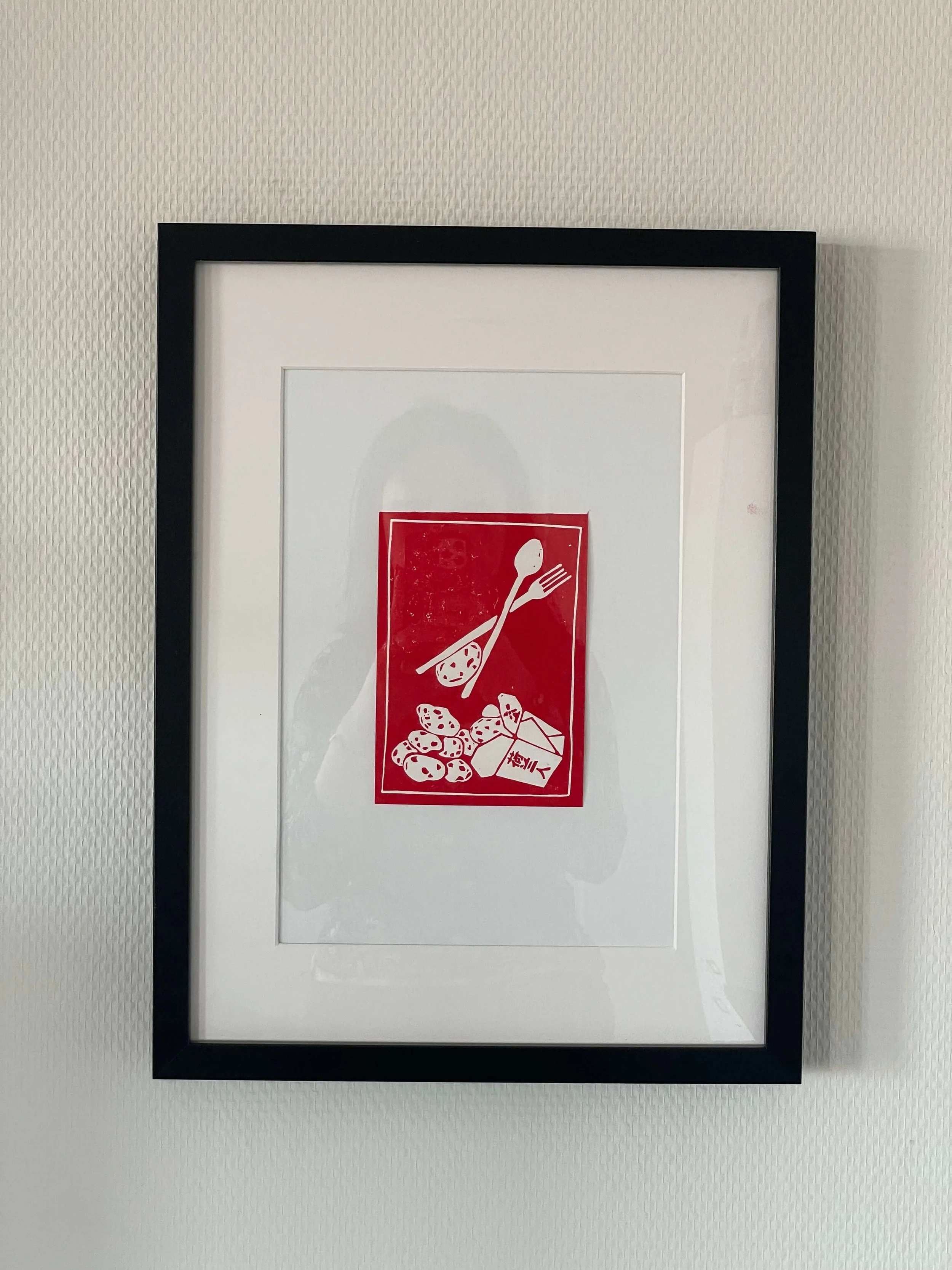 Een Chinees afhaalbakje, gevuld met aardappelen. Op het eerste gezicht een vreemde combinatie, maar voor mij klopt het precies. Aardappelen zijn het lievelingseten van mij en mijn moeder een maaltijd die voelt als thuis. Maar deze linodruk gaat niet alleen over eten. Het gaat over verwachtingen, over buitenkant en binnenkant. Over hoe vaak ik ben gezien als stereotype, en hoe weinig moeite er wordt gedaan om te begrijpen wie ik écht ben.