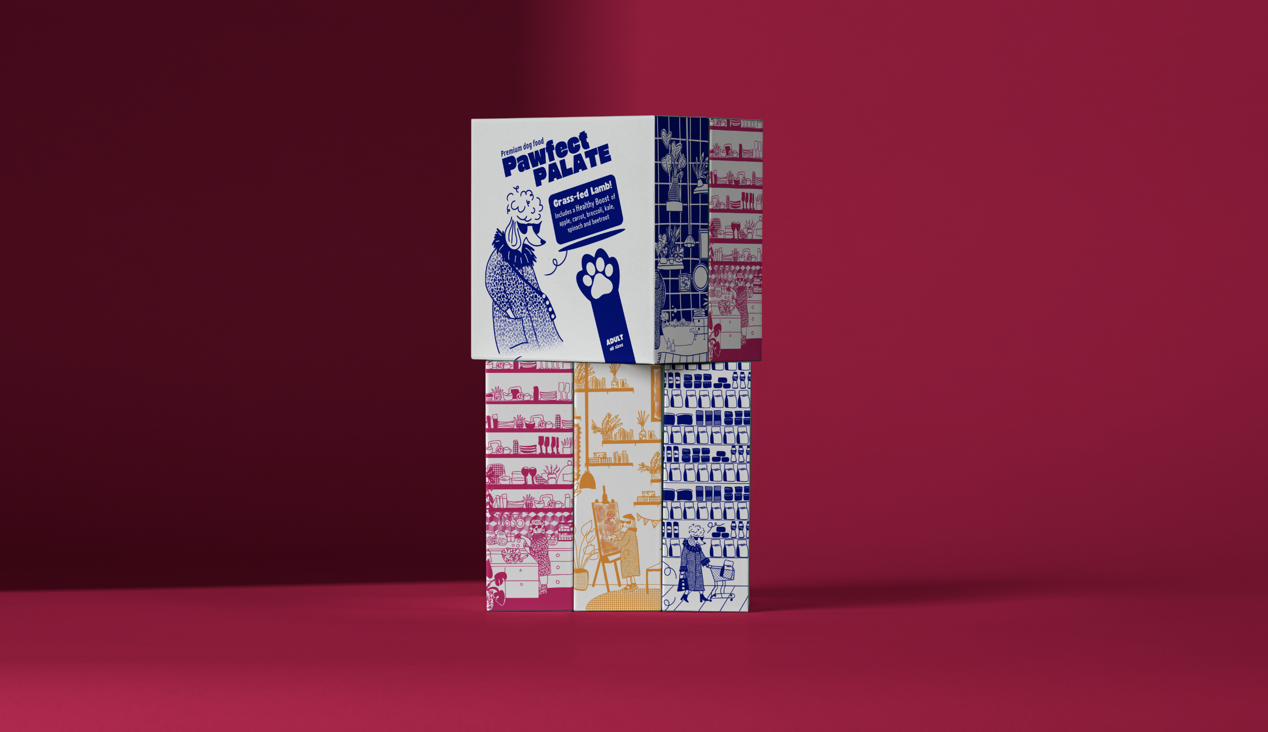 Met mijn ontwerp heb ik Pawfect Palate een frisse en speelse uitstraling gegeven, vol vrolijke hondenillustraties die direct opvallen. Door humor en een moderne stijl te combineren, heb ik een merk neergezet dat niet alleen staat voor goede voeding, maar ook voor plezier en een persoonlijke touch in het leven van hondenliefhebbers.
